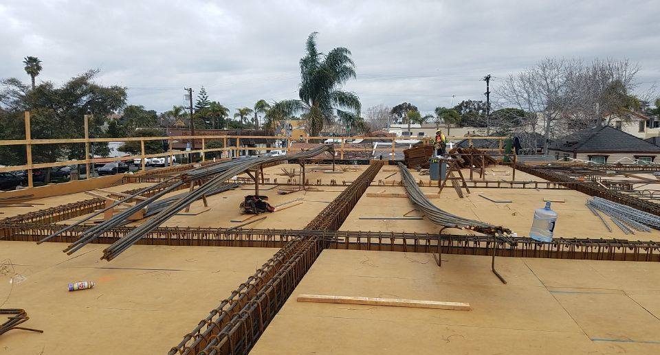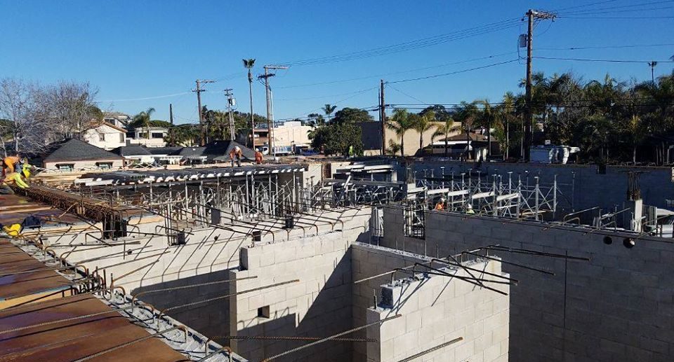 Despite rainy Southern California weather, progress is still being made on many projects, including the Stake and Oak project in Carlsbad, CA. the slab, footings, and CMU walls have been completed. Now we are forming for the podium deck.