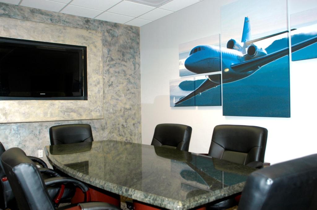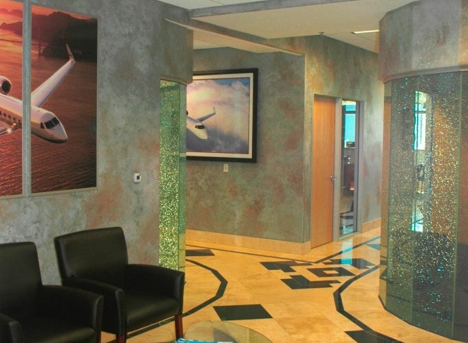 6,000 Square Feet of high-end executive office space with conference rooms, training rooms and kitchens. Finishes include cracked glass, stone corridor floors, soffit ceilings, and faux finished walls.